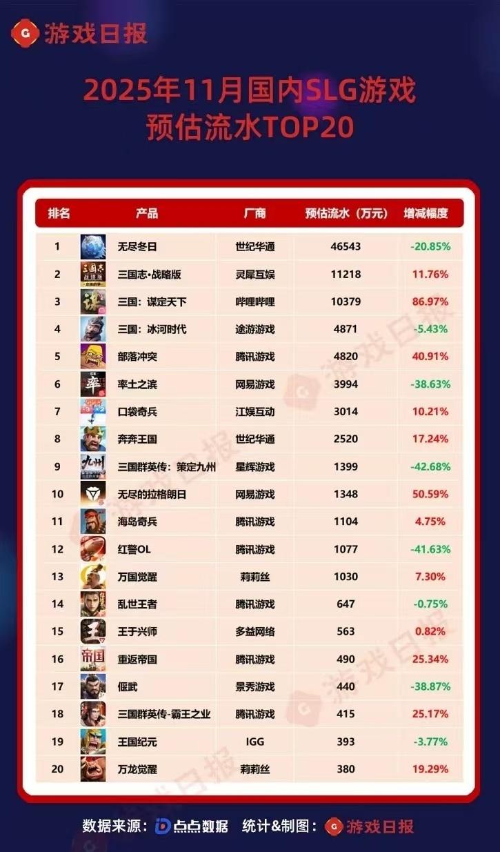 无尽冬日还是独占鳌头,咱也不知道到底这游戏有什么魔力。三战增长了10%,也还不错,三谋这个半周年庆典真是给力,猛增86%。率土一下跌到了第六名,新游里王于兴师还是保持稳定,也算难得。