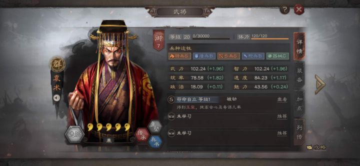 武将生平袁术(?—199年),字公路,汝南郡汝阳县(今河南商水县)人。东汉末年军阀,司空袁逢嫡次子,太仆袁基、冀州牧袁绍异母弟。举孝廉出身,拜为河南尹、虎贲中郎将。董卓进京后,拜为后将军,畏祸出奔南阳郡。初平元年(190年),联合袁绍、曹操等关东诸侯,联兵讨伐董卓。此后,对抗于袁绍和曹操,兵败逃亡九江,割据扬州。建安二年(197年),僭位于寿春,建号仲氏 。骄奢淫逸,横征暴敛,导致江淮地区残破不