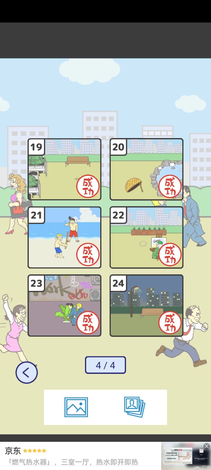 直接上攻略啦,这次游戏比较简单,就不再逐页截图了,先放文字版本。如果后续大家反应还是图文结合更好的话我再加图文版本~第一关:点击向右箭头,来到右侧画面,点击垃圾桶,过关。第二关:来到右侧画面,点击自动贩卖机底下的100日元,然后拖到小卖部使用,得到一份报纸。回到左侧画面,对椅子使用报纸,过关。第三关:来到右侧画面,打翻垃圾桶,捡起美女杂志,把美女杂志给左侧画面的守门员,然后点击足球,过关。