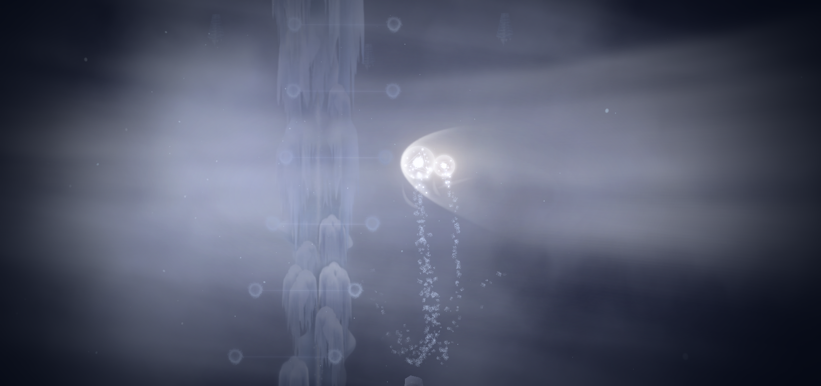 第一阶段很好理解,就是点灯,当我们靠近悬浮的小圆球时,一片区域会被点亮,接着去点亮更多的小圆球。虽然是简单的解密,但她总是有自己的想法,喜欢四处探险,不走寻常路,结果就是闯入黑暗后掉回去,重新再飞一遍。不过好在还是顺利的来到了第二关。
