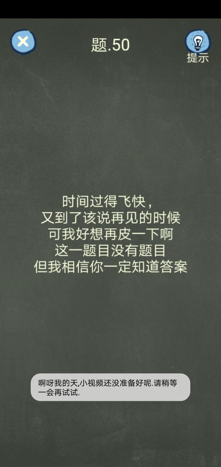 第五十关是一定要点提示看小视频再得到提示才可以过关,但是我这关都卡两天了,小视频还是看不了,不晓得是不是游戏的问题。。。。