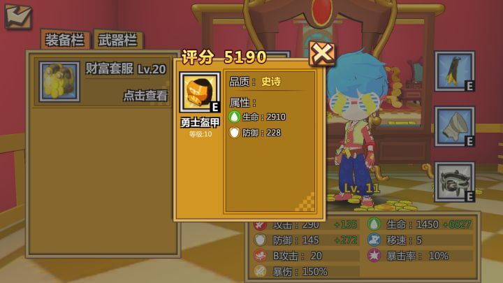 上面就是我11级的全部了。话不多说,直接开讲,初期的时候尽量集齐三把大剑,一把拳头,一把布,一把剪刀,应对不同的敌人。为什么选大剑呢。因为大剑容易出防御属性,这个作用等下会用到!接下来就是金币了,第一章副本里,先做5个副本,这样子也就有了一定的装备撑伤害了,能撑的住伤害时。找到带金钱图标的副本。进去里面会出现需求怪物的图标。不要用游戏里满%100电量的手机清怪过任务,利用剪刀石头布对应来打