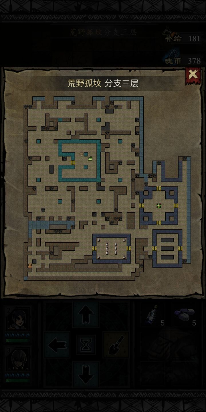 第三层(密道)地图萌新挖到鲁班钥匙🔑就兴冲冲地开了机关门进了支线地图,把整个图都快挖遍了,补给都快没了,还没找到出口,都快哭了,难道要死出去吗😭😭,我挖了那么多宝贝呢,结果才发现地图中间有块墙没挖😰还好还好,活着出来了🤪地图献上,看哪个小可爱不小心步我的后尘😝又进去了一次,地图是随机变化的,但是出口的地方是固定的,蓝色方框中间第三层地图按照碑文提示:东木,西金,南火,北水四个石像的位
