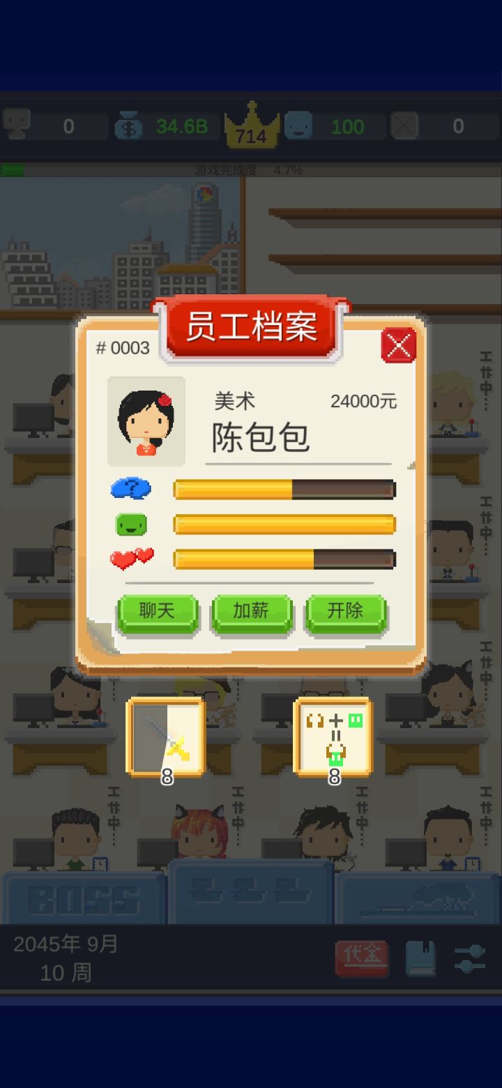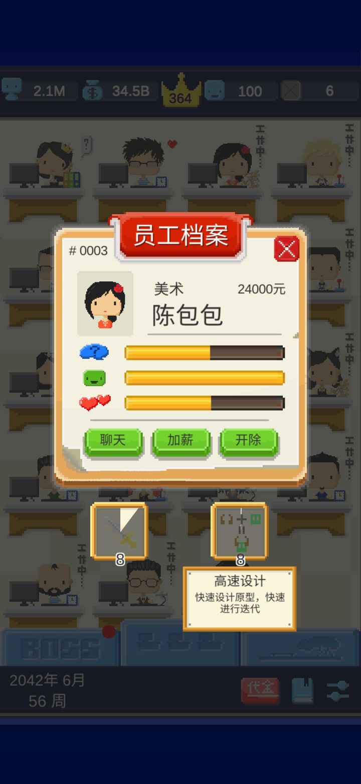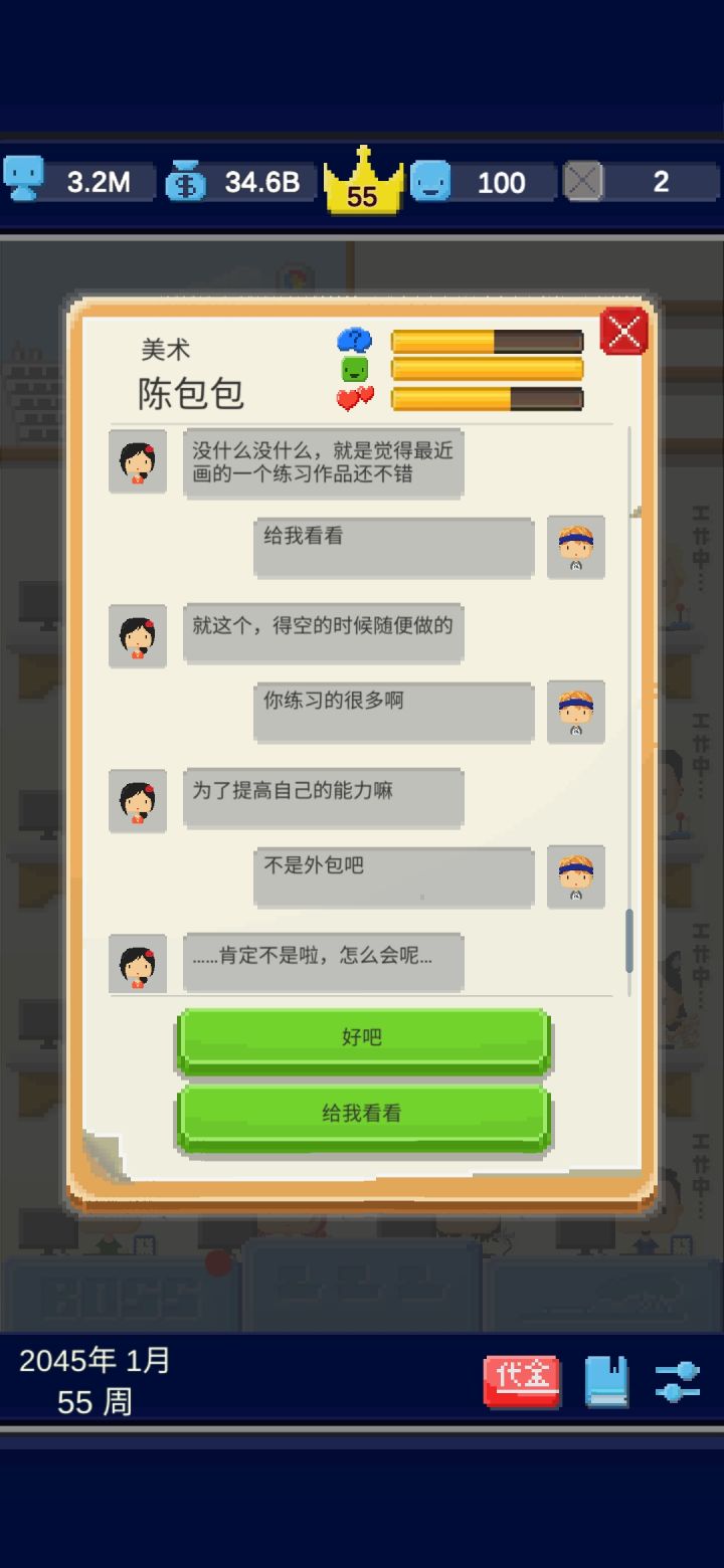 陈包包二技能给我刷出来了,作用好像是增加玩家人数,不过我是周目后期才刷出来的,用了也基本白用,不如钟策划和何分析之类的涨粉技能有用。p3才发现她画的“练习作品”是外包😂难怪叫陈包包。推荐一个刷好感的方法——员工冒❤️的时候去对话“这么开心?”,只要这个选项还在就一直点,每次都加好感。那些好感难刷的员工都可以这样刷,比隔一会才可以触发的日常对话加得多。