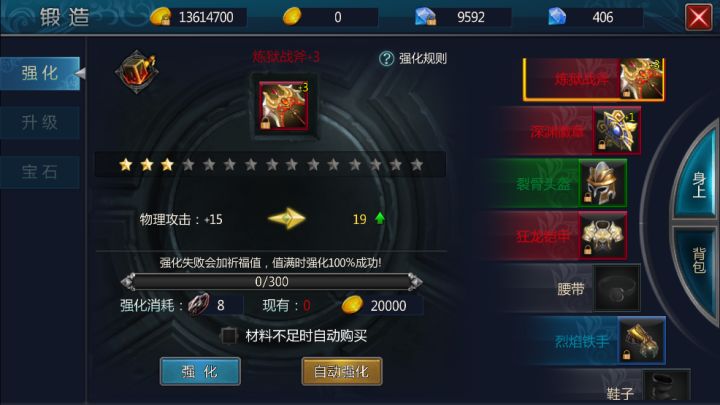强化系统主要强化角色的装备部位,永久增加属性。免去了玩家更换装备时反复传承属性造成的困扰和装备掉落后的损失。各部位强化增加的属性不同。升级系统非转生装备可通过升级系统获得,最高可升到70级三件相同的装备可以合成新的同部位同职业的装备已穿戴的装备不能当做合成材料进行合成宝石系统角色65级时可以激活生命宝石、物防宝石、魔防宝石攻击宝石、暴击宝石、暴伤宝石需要升阶其他宝石才能激活宝