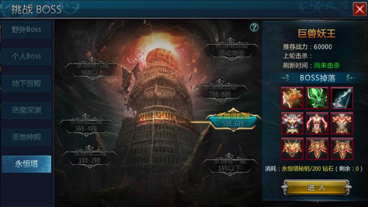 永恒塔用来封印强大的上古魔兽,塔内充满神秘而恐怖的气息,从四面八方聚来的勇士都争相进入冒险挑战。 通过主界面右上方的“BOSS”图标进入,进入需要消耗永恒塔秘钥或者200钻石。永恒塔一共分为6层,达到相应的等级才能挑战相关的层数,每层都有强力的BOSS驻守,击杀BOSS可获得极品装备稀有材料。