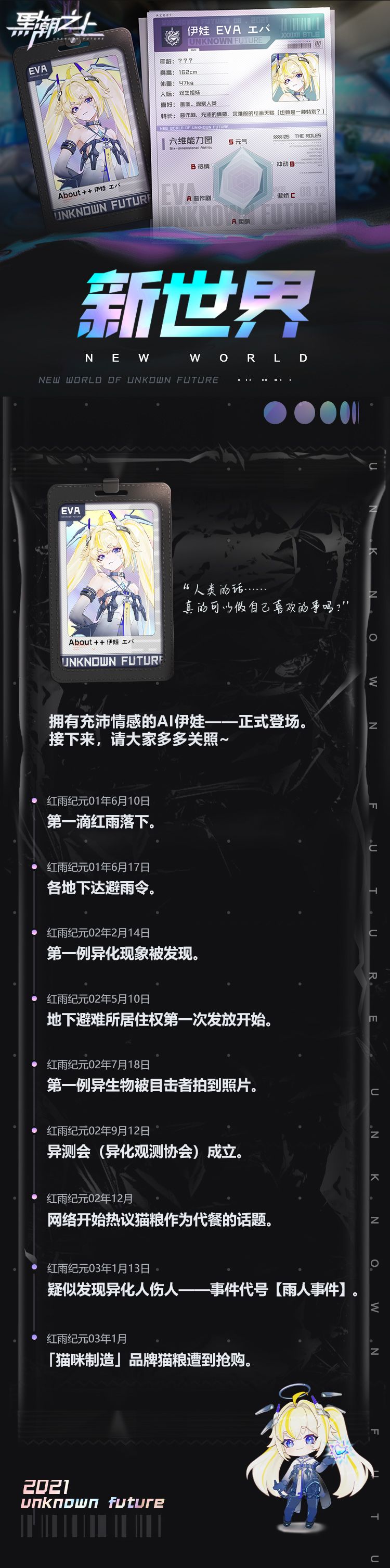 本月总结,就让「伊娃」来吧~ ◆新世界 - 「伊娃」营业!「人类的话……真的可以做自己喜欢的事吗?」 ◆新事件 - 新势力现身,“喵”势力登场,憨某有了新去处? ◆答疑 - Q版模型、全新传送方式进度曝光,知晓三大势力更多资讯↓↓ *点击最下方三格展开长图,查看本月最新情报~ *新世界正在开发中,以下内容不代表最终游戏品质。