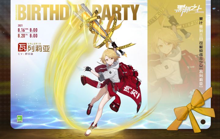 「这个世界也许的确是一团糟,但是我有我想守护的东西。」◆瓦列莉亚的生日签到礼:8月16日-8月20日,进入游戏中福利界面-生日派对,累计签到3日即可抱走战斗少女「瓦列莉亚」。◆瓦列莉亚的生日礼包码:hc8mmk46ny生日快乐,瓦列莉亚!8.18是她的生日,属于她专属的生日祝福,大家都准备好了吗?