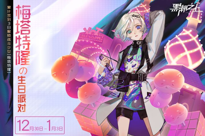 //梅塔特隆的诞生贺礼活动时间:12月30日——1月3日活动说明:在《黑潮之上》-福利界面,点击「生日派对」活动,累计签到3日,即可带走这位来自深渊的支配者——「梅塔特隆」!(除了梅塔特隆外,在其它角色生日期间,登陆游戏参与“少女生日派对”,也可以获得她们哦~)接触者们,一起为梅塔特隆送上生日祝福吧~游戏最新资讯、游戏福利礼包、游戏问题和建议反馈都在这里!官方交流群:553063013