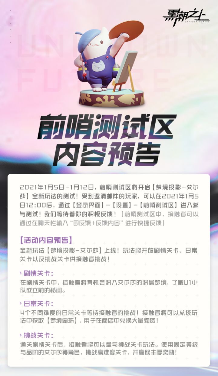 各位接触者:2021年1月5日-1月12日,前哨测试区将开启「梦境投影-艾尔莎」全新玩法的测试!受到邀请邮件的玩家,可以在2021年1月5日12:00后,通过「登录界面」-「设置」-「前哨测试区」进入参与测试!我们等待着你的积极反馈!(前哨测试区中,接触者可以通过在聊天栏输入“@反馈+反馈内容”进行快捷反馈)*本期前哨测试区入选名单,请各位戳查阅~感谢接触者对《黑潮之上》的关注与支持。游戏