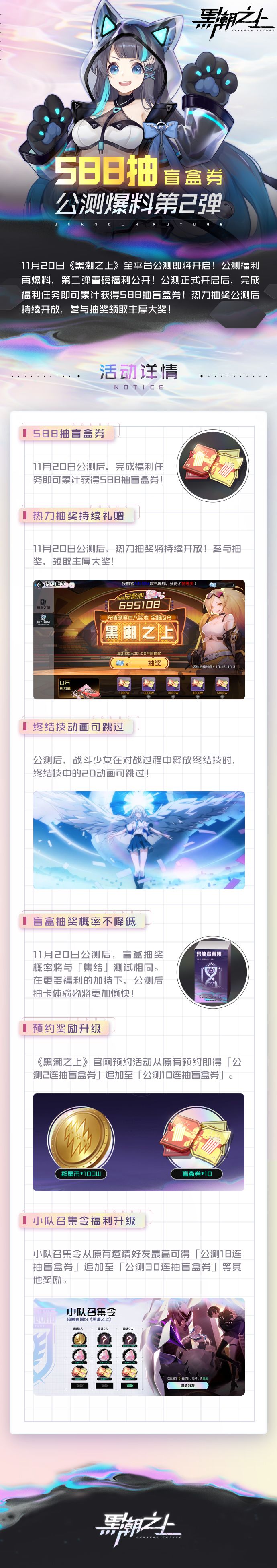 《黑潮之上》全平台(PC、Android、iOS)公测定档11月20日!更多福利及情报将在近期放出,敬请期待。这一次,你我将正式携手战斗女团,“无限体力,逆转世界!”定档视频现已登陆:公测定档这么重要的事,怎么能少了本喵的福利放送环节呢——//活动时间:10月30日——11月8日23:59//活动内容:将《黑潮之上》公测定档信息分享至社交平台(微博、朋友圈、空间等),并带上内容“《