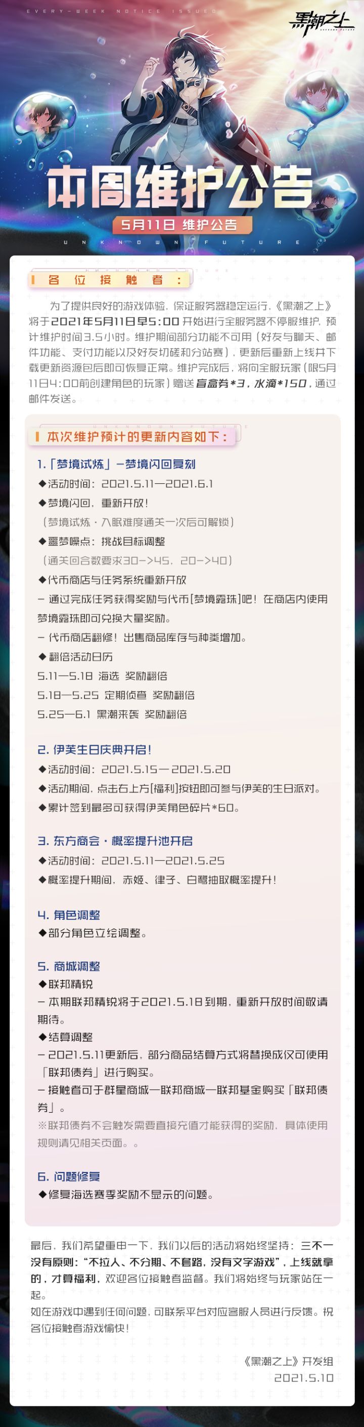 各位接触者:为了提供良好的游戏体验,保证服务器稳定运行,《黑潮之上》将于2021年5月11日早5:00开始进行全服务器不停服维护,预计维护时间3.5小时。维护期间部分功能不可用(好友与聊天、邮件功能、支付功能以及好友切磋和分站赛),更新后重新上线并下载更新资源包后即可恢复正常。维护完成后,将向全服玩家(限5月11日4:00前创建角色的玩家)赠送盲盒券*3,水滴*150,通过邮件发送。具体详情,请