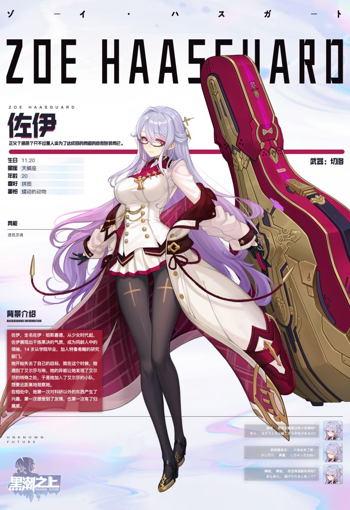 正义?邪恶?只不过是人类为了达成目的而做的自我包装而已。===================================姓名:佐伊Zoe Haasguard生日:11月20日星座:天蝎座年龄:20喜好:拼图害怕:蠕动的动物异能:透视灵魂武器:切洛===================================佐伊,全名佐伊·哈斯嘉德,从少女时代起,佐伊展现出干练