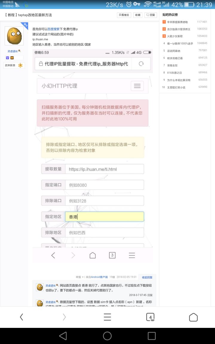 ip.ihuan.me这个经常说资源占用过多,不过下面有友情链接,有比较好用的,切记提取ip成功率高毕竟很多人都在用挺卡的,再输入任意WIFI的手动代理中,建议复制ip然后端口自己记,然后打开tap刷新如果成功就可以改啦,不成功继续找ip和端口,总可以的