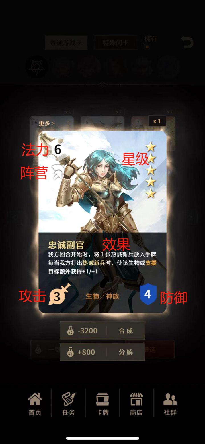 一、卡牌六要素1、 法力:打出这张牌所需消耗的法力,角色每回合会恢复法力。2、 攻击:生物卡专属。3、 防御:生物卡专属。4、 效果:卡面上描述的效果。5、 阵营:如果法力消耗下方有阵营标注,则表示这张卡只能由某个阵营使用。反之贼为通用阵营。6、 星级:表示卡片稀有度,无战斗意义。1~4星卡牌卡包中最大携带数量为3。5星卡牌最大携带数量为2。二、游戏货币与卡池本游戏共有四种货币1