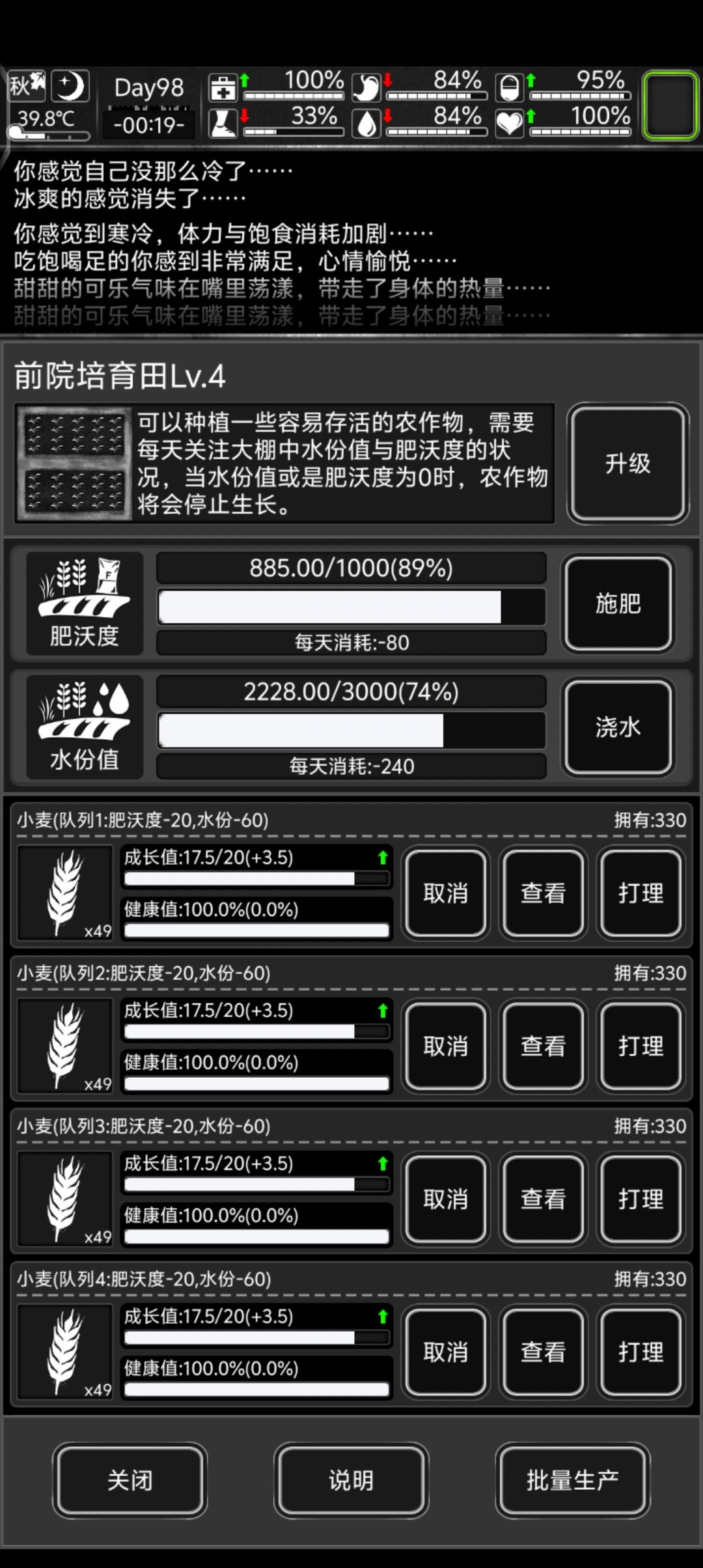 食物主要来源:陷阱(抓头牛就是七个肉,探索走半天才两三个,不够吃)>探索>交易 食物负面影响:食物中毒(过几天自己会消失,后期才能制作止吐剂,完全就是逼着你打扫卫生) 玩了几小时开巨大图,感觉不好玩,没意识,还不如还有点卡不知道怎么回事,无语,还不如加拿大死亡之路好玩(也是像素游戏,狗狗是你最忠诚的爸爸,好像还会开车)