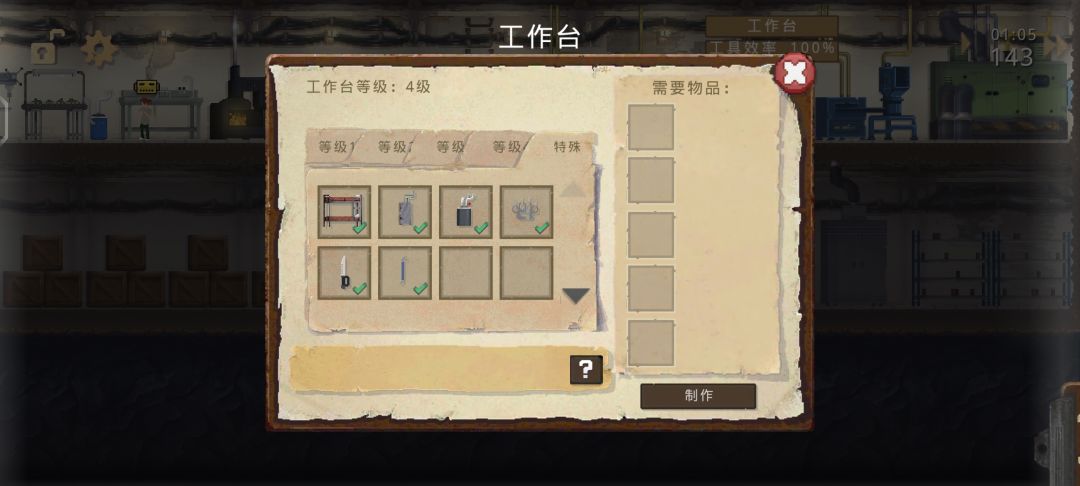 第一个档案的野营箱车部件集齐了,这次是重开游戏嘞。 这次我换了个思路 两个小孩出去探险,我给小孩都选的高感知。两个大人都是智力高,其中一个大人少食。 我宠物带的是犬,犬伤害很高的,一回合让对面掉大半格血 1.这次我首要任务就是把工作台升到满级,开局就造了俩塑料袋,然后一直慢慢攒够材料(攒的过程种顺带搜集大帆布背包所需材料)。升到四级我首先就是一下造俩大帆布背包。 2.等工作台升到四级后,我下一