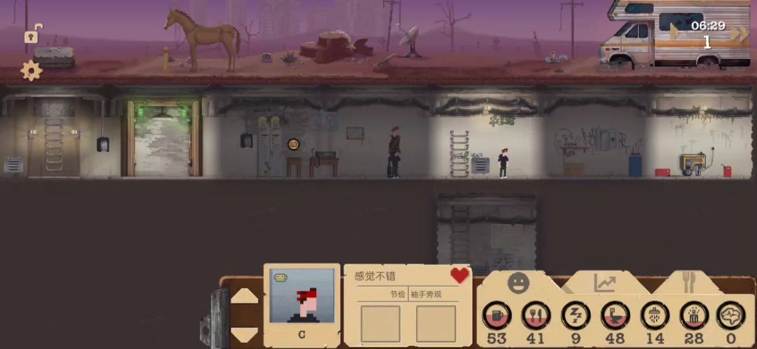 再补充小细节,图片在第一篇哦!这篇主要介绍前期的注意事项1 需要水,下方是载具,只有载具的名字出现后才算使用上载具。2 避难所外面,空气净化器和净水器的修复都很慢,切勿让一个人干这个活,可以让两个人穿防护服,一个人修一个。3 户外搜物资时,注意各武器的条件哈,只有达到力量后,才有那么多伤害哈!木头和管子都可以当武器哈4 因为游戏上手难度高,所以建议开局先往最简单的玩法调,等熟练了再增加难