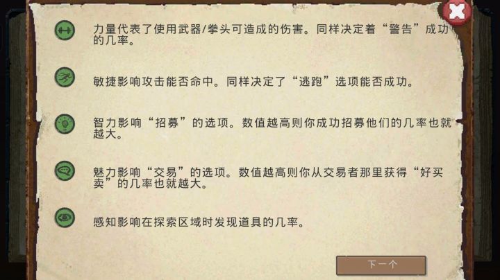 【开局】不要为难自己【属性解析】力量:影响能拿什么武器和打出的伤害,恐吓他人的成功率、被攻击时抵抗概率(?)敏捷:影响出手顺序、攻击命中率、被攻击时反击概率(?)感知:探索时搜索到的物品数量,搜到特殊蓝图的概率魅力:电台招募到的人物属性更高,交易时买更便宜卖更贵智力:建造修复速度加快,可以使用特殊工作台——————【特性与负面特性】开局可以选一个正面特性,进入游戏后随机一个负面特