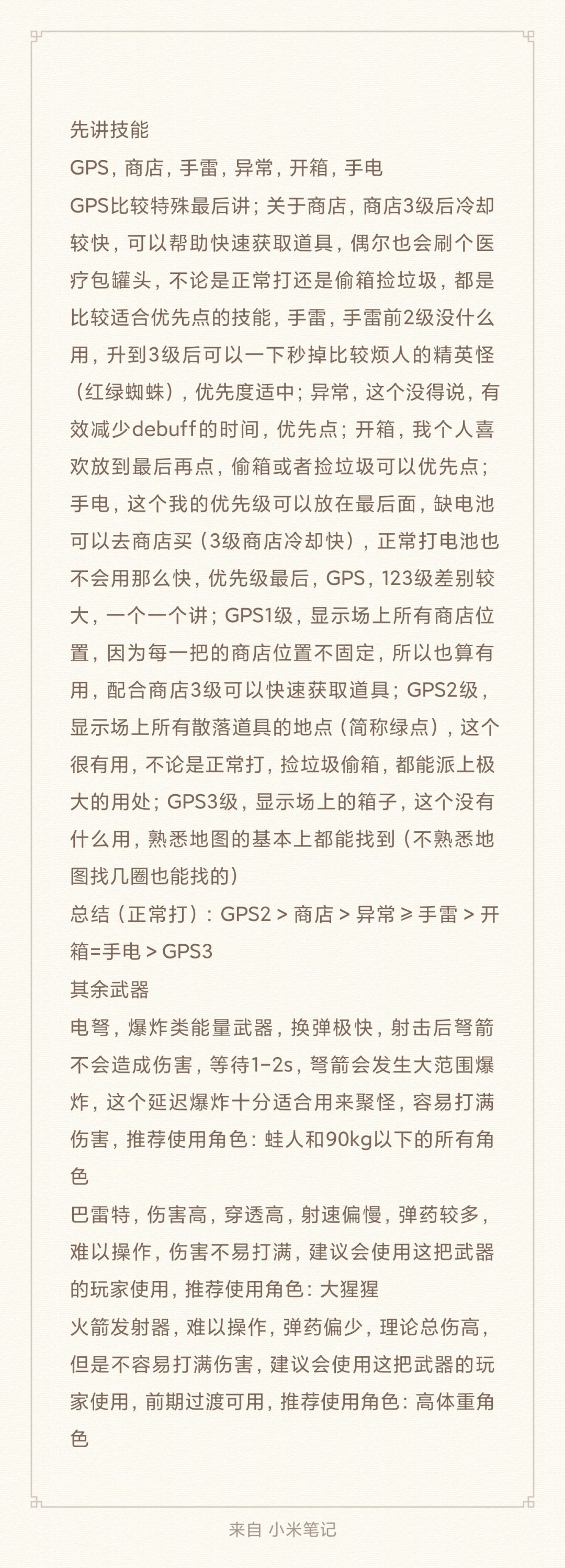 总数据 关卡全3星 生存14次:居民3、农场2、监狱和港口各1、联机7(手机热点联机100H左右会卡死) 防守3次:最高61,怪太多,被卡死了,不然还能玩 新手小技巧 1.武器有重量,推荐一轻一重,轻:跑、点射BUFF怪;重:群伤、站撸 2.人物有属性侧重,生存速度,防守生命体力 3.推荐吸血鬼,关卡、生存、防守百搭 4.部分武器可以换弹时跑步,停下来就换弹成功(电子弩、加特林、榴弹、火箭筒、巴雷