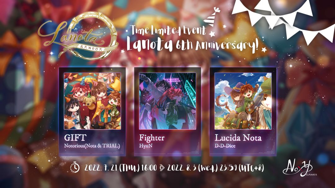 限时活动“Lanota 6周年派对!”即将开跑! 【活动乐曲】 GIFT / Notorious(Nota & TRIAL) Fighter / HyuN Lucida Nota / D-D-Dice 活动时间从7月21日开始,现在就先更新到Lanota 2.15.1版做好准备! —————— 更多活动和信息请关注我们: 官方微博 及B站~ 也欢迎来咱Q群唠嗑:289681231