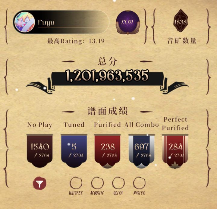 去年忙着电竞了,没时间发帖,有好点存货,接下来依次发。入坑盘子30h了,我才勉强上了15,然后Rating卡住了(瓶颈了qwq)下面是我的一些成就:p1(并非,只是我最高11-12忘记截了)是我lanota的b1,超水15+,我认为只有14+,单曲Rating16.53(11-12那把)除了底力还要点拆谱力,同时在60ms下还要点准度,否则就会打了但是掉光(猜猜我11-12,lost比tune