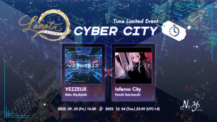 限时活动「Cyber City」即将再临!【活动乐曲】VEZZELiX / Reku MochizukiInferno City / Ponchi feat.haxchi复刻活动时间从9月23日开始。现在就更新到Lanota 2.17版做好准备吧!——————更多活动和信息请关注我们:官方微博 及B站~也欢迎来咱Q群唠嗑:289681231