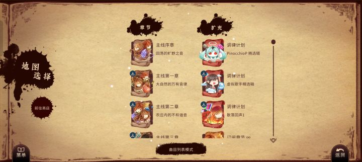 ①购买本体:序章+主线一~七章+扩充A——6元得65首②主线:第八章 68元得8首③支线:第一章/第二章 28元 6首——56元得12首④调律计划:散落回声1 28元 5首PinocchioP精选集 28元 3首虚拟歌手精选集 28元 5首——84元得13首⑤扩充章节:B~Z 28元 5首(p.s.D&Q为6首)——700元得127首⑥限时活动+商店兑换:基础兑换