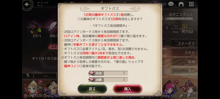 翌日登录游戏生效,会向邮箱发送三枚指定角色的好感度碎片。生效期间无法向指定的角色赠送礼物。bingo赠送的道具。没什么用,更像是为了展示礼品劵(gift pass)这个功能。