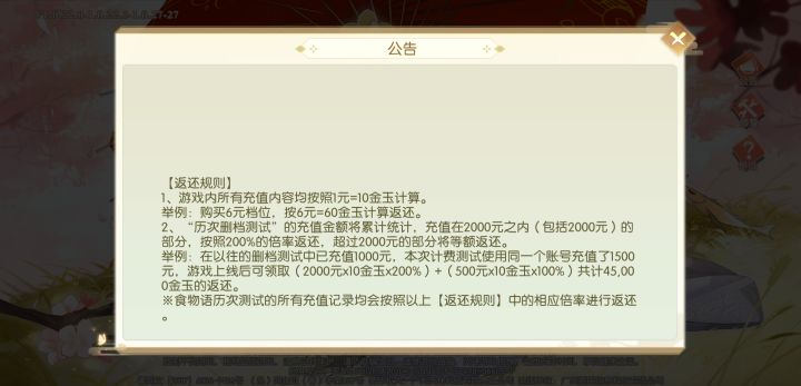大家好,这里是二测入坑的老咸鱼一枚,昨天开服拉了几个小伙伴一起入坑,结果他们吐槽氪金项目眼花缭乱,不知从何氪起,于是我花了一晚上整理,写成的此篇攻略,希望对能有帮助大家。一、充值返利规则具体返利规则如图所示,还是比较容易理解的,不过有些注意事项没写明,有必要提一下。1、返利返还的是金玉。至于月卡、折扣礼包等仅限RMB购买,而公测返还的玉只能抽卡买道具。2、返利按1:2倍率返还,正常氪金是1