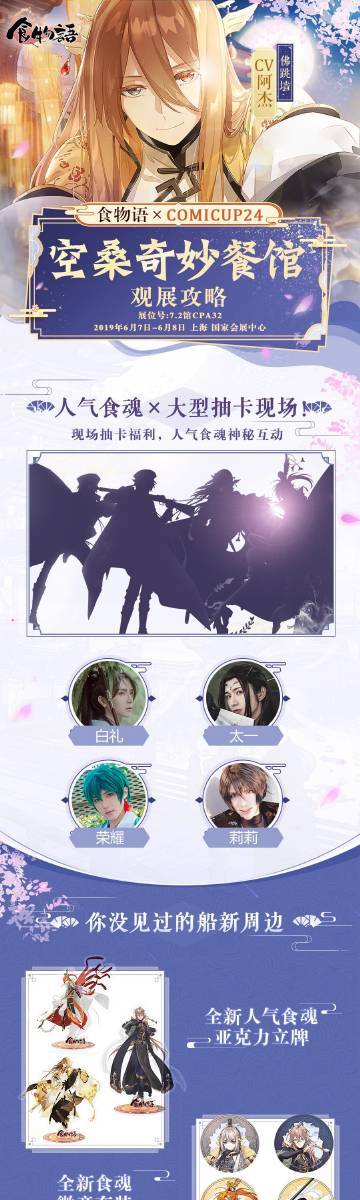 Comicup24参展决定美食化魂,一味倾心!食物语即将在CP首次亮相展会时间:2019年6月7日-6月8日展会地点:上海 国家会展中心展位号:6.2馆 CPA32你们希望在现场看到哪位食魂呢?还有神秘互动,多重场限周边福利?听说还能现场催公测……(你可少说两句吧完整活动内容、周边曝光、漫展福利全攻略,敬请期待后续爆料哦!