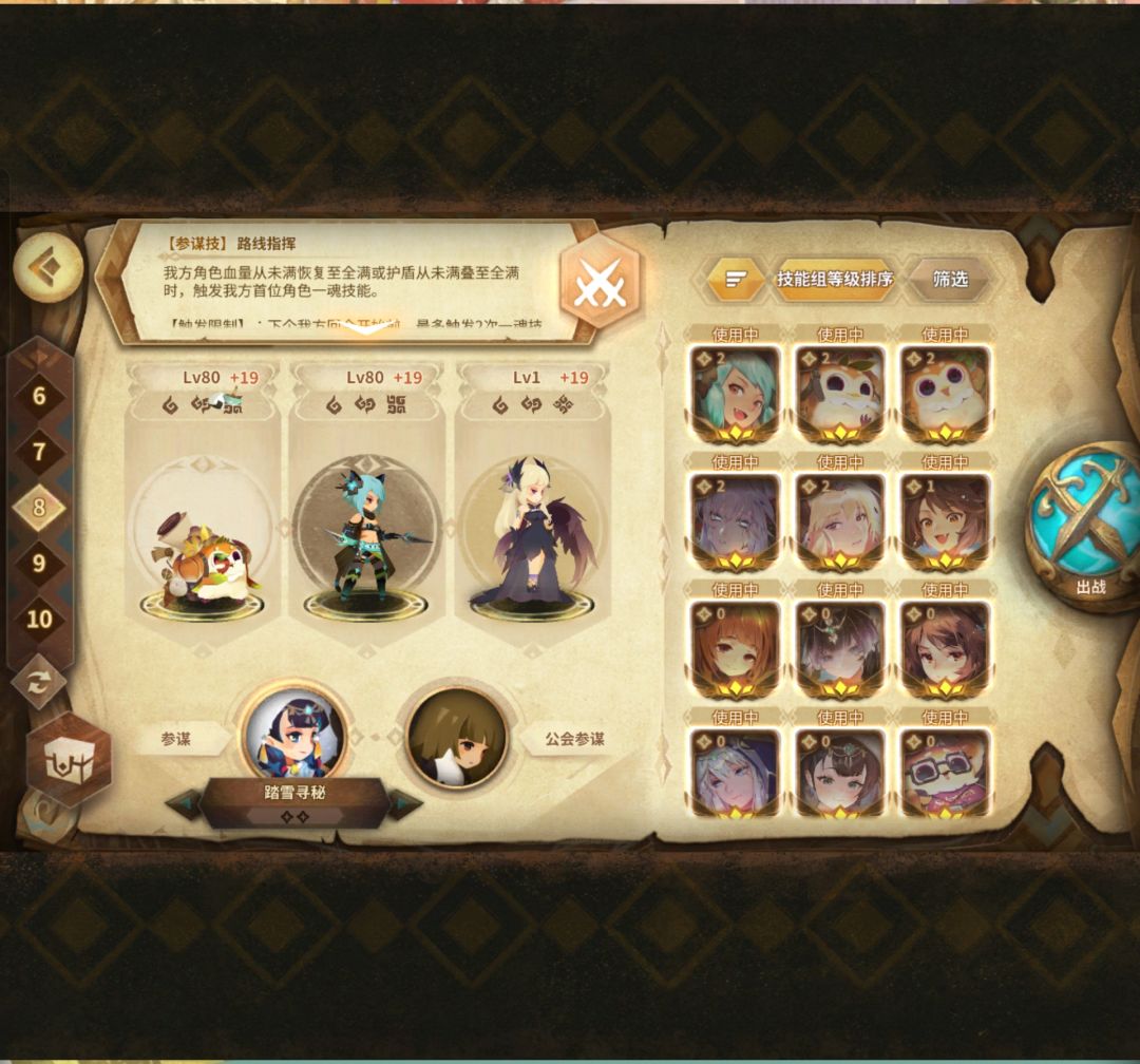 鉴于你游没活动时实在太无聊[表情_翻白眼],所以就自己给自己加点乐子,用当期的角色作为主力,配上经典角色亲友来打各自的装备好了。 雷萨线:荒漠野营+暗之行 荒漠野营 场地效果:回合结束时,施放技能的我方单位获得三层弱化和三层中毒 阵容:蓝苜蓿+081,老蛇+151,雷萨+050 出战携带: 进图选结算,符文全程不拿,进入战斗全程指白。 前戏-荒漠野营:老蛇注意续延命,其他都交给女王三二一秒了。