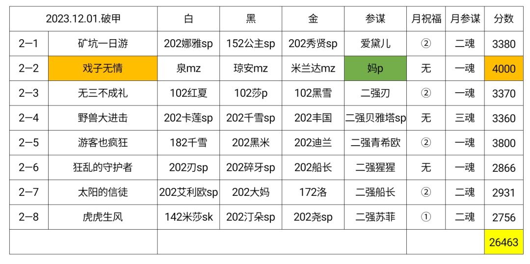 上周没有202库尔sp 感谢黑夜大佬提供的满分打法 开局转块,用箱,至少出三个强化白, 指白一强白三*3, 开局指金,指白用箱,白三 卢恩动黑白,白一;白一;用箱金一;金二,补刀 满分流程,需求202杨波sp,雪尔森sp74+202 白一,白一,金三(至少7黑芯),用箱补刀 全程指黑,金三,黑六用箱,黑六*5,用箱 跟往期一样,抄下虎哥作业 感谢白熊大佬提供的满分轴,我摸好久都只能2999 048
