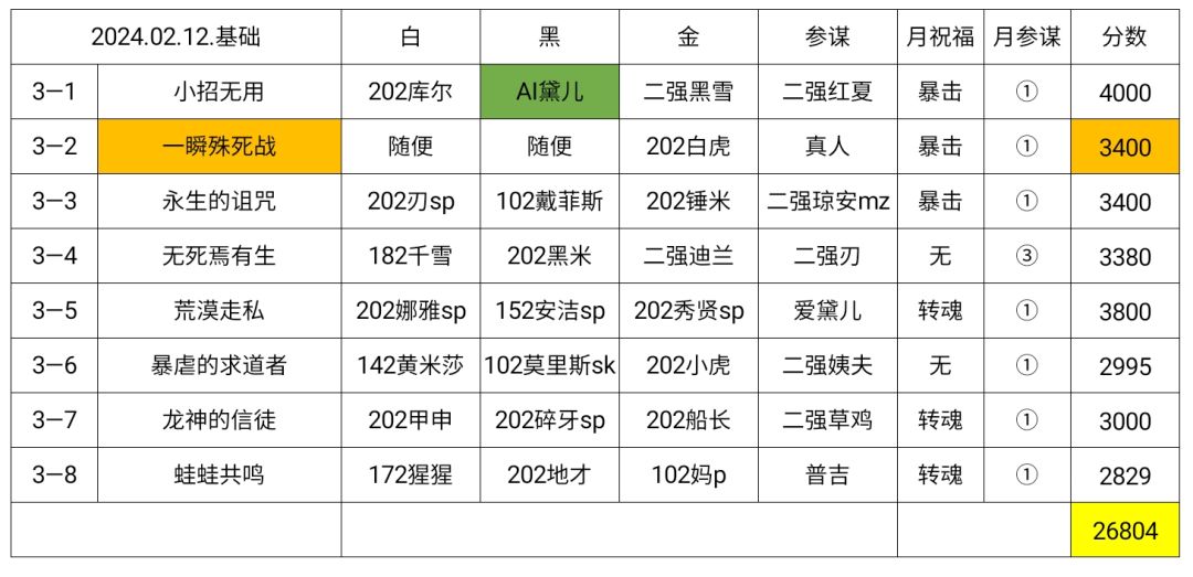 3-1:小招无用 3400(-0)月祝福0 月参谋0 202库尔+152爱黛儿sp(1级)+102雪莉sk(1级)+102贝雅塔sp参 魂盘刷左白6 P1 指白 金4 P2 白4 P3 白1 P4 白2 3-2:一瞬殊死战 3400(达成) 月祝福3 月参谋3 米沙sk+海德sp+202庞sk(白虎)+杨波sk(真人)参 金3自动 黑白位可随意带,不触发被动行动的角色能快一点打 3-3:永生的诅