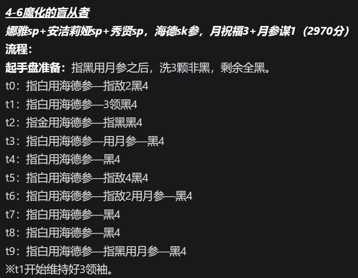 自动自动自动金3,没死箱子补刀 黑4金3乱打 金位血多点(雷劈不死)能打伤害就行,复活魂芯10 金x(打伤害),指金用箱;3领白4;指金用箱抢消3领白4;3领白4,指金用箱。 白位可以换卡莲sp,多buff黑4到底也能出分 白黯月没二强:每面开局指白。白3;指金2怒白3;金3;指金2怒白3,箱子。 二强了:无脑指金金3 无箱解很多,,本周可用②④。这套是开局一直指黑,有4领黑4用黑4,第二三面指敌