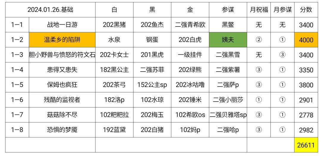 今天初二,正好遇到家里来人拜年忙活了一天,总算抽空把幻境也打完了,这里也顺便给大家拜个年,祝大家身体健康,万事如意 满分 开局指白,指金四,箱子补刀 金四,箱子补刀 *3 满分 全程参谋给黑用 白六 指2黑一 指2黑一 指黑用箱,黑三 满分 全程开局指白,箱子一直用,参谋给白 白一 白四 白一 战意白一 -40 需要降级女王, 调黑六魂盘,调慢速, 指黑用箱,抢点两次符文师,抢消黑六, 黑六 黑六
