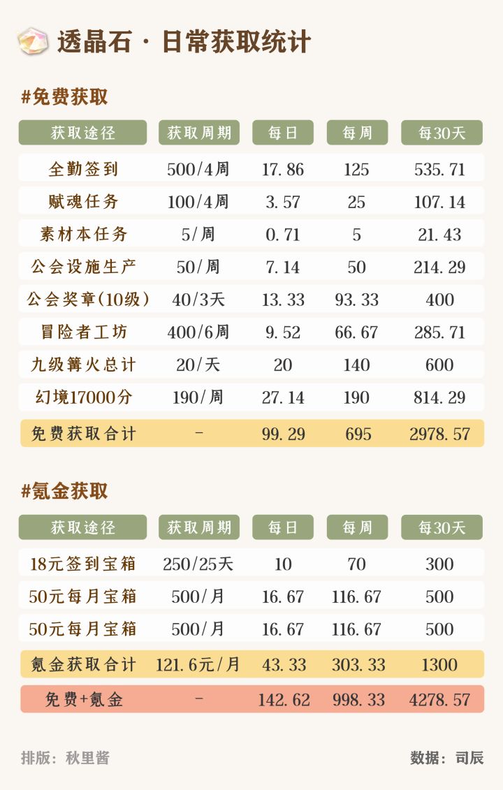 表中整理的是各种资源的稳定可重复获取途径,以及透晶石、魂晶碎片每日/周/月的平均获取量,方便各位规划自己的资源。(2022/8/24更新v1.0)感谢秋里酱!有了好看的新排版!(2022/9/10更新v1.4)修改一些数据错误透晶石获取:魂晶碎片获取:附录:鸣谢:秋里酱、泡泡茶壶tips:1. 主表中的数据均使用最高档,详细数据请参考附录。2. 欢迎各位随时捉虫~3. 公会任务
