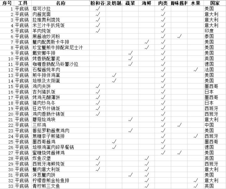 解锁菜谱带着随机性,总刷不出来自己想要的东西,最后解锁出来发现跟自己猜想的完全不一样。希望这个菜谱能帮助到你。本菜谱按照游戏内的菜谱排列,等更新完,我看下用什么放ex表格上来方便你们查找√以下是菜谱直达链接: