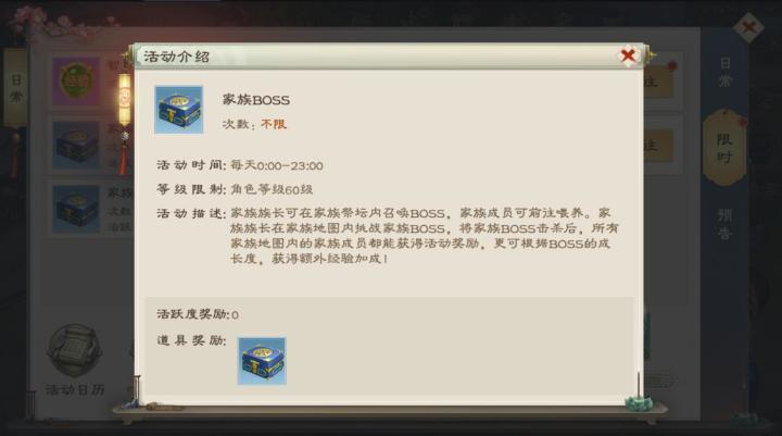 一、家族BOSS简介家族BOSS是绿色征途的一项特色玩法,家族族长可在家族祭坛内召唤BOSS,家族成员可前往喂养。家族族长在家族地图内挑战家族BOSS。将家族BOSS击条后,所有家族地图内的家族成员都能获得活动奖励。更可根据BOSS的成长度获得额经验加成!二、家族BOSS活动要求1.家族族长和家族成员的角色等级60级后开启,可前往家族地图祭坛召唤BOSS。三、家族BOSS培养流程1.家族