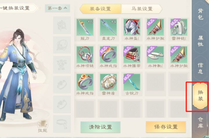 一、一键换装简介在游戏中,有些少侠是喜欢打怪刷副本的PVE玩家,另一些是喜欢打架竞技的PVP玩家,但是多数人都是喜欢同时体验两种玩法的。众所周知,打怪与PK需要的属性是不同的,甚至是天差地别。。今天小编就来给大家介绍一下游戏中的一键换装功能。二、系统详情首先点开背包,点击换装。这里可以选择将这套装备设置为第几套。将装备设置好后,点击保存设置这时就可以在主界面中随时切换装备啦~是不