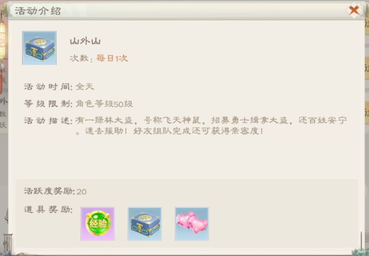 一、山外山简介山外山是绿色征途手游的一项日常活动。前去讨伐绿林大盗飞天神鼠。击败后可获的经验、神秘宝箱等丰富的奖励。二、任务详情1.前置条件当角色等级到达50级,就会开启山外山活动,前往NPC大剑师处接受任务。2.击杀条件飞天神鼠相当于初级的野外boss首领,建议玩家组队前往。而且好友组队完成,可以获得亲密度的奖励。小编用亲身实践证明了,一个人也是可以完成的,但是战力要高一些,药