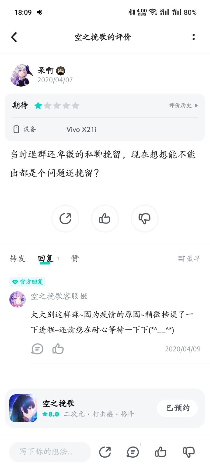 空之挽歌,我有幸参与过测试,给我留下很棒的印象。手搓技能,无限连招,建模也挺精美,我是非常希望这游戏上线的。所以官方你赶紧活过来啊😭😭
