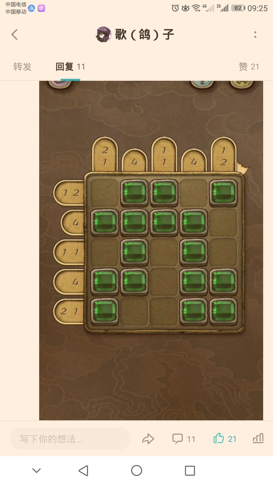 游戏规则:每行和列旁边的数字表示连续填满格子的数量 比如下图中上面一行最左边的数字是2和1,就代表第一列中从上往下要填满的格子依次是2个和1个 就像这样 再慢慢推理出剩下的图案就过关了