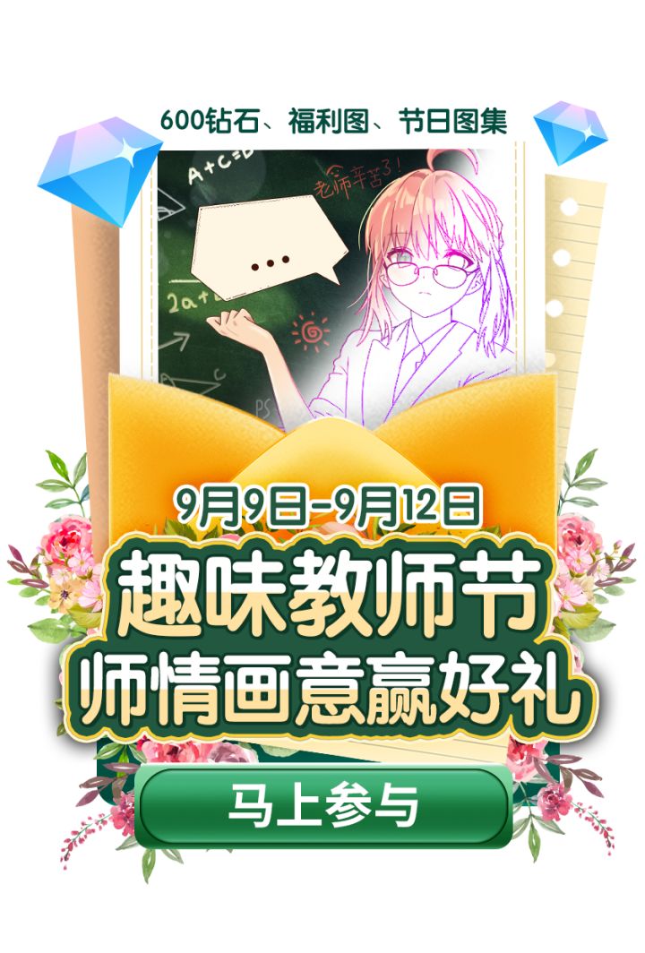 师情画意大比拼 赢超多钻石教师节快乐,老师您辛苦啦!叮铃铃🙌 上课啦!上课啦!脑里有哪些老师金句在游荡!甜填妹给你一个发挥的机会涂色教师节稀缺精美福利图 画出师生情 DIY老师金句 参赛投票PK 赢取600钻石!(下面了解领取及参赛方法哟👇)【方式】微信公众号后台回复“教师”,领教师节福利图参与活动【参赛规则】1.领教师节福利图,涂色下载2.在福利图气泡内填写老师金句,保存