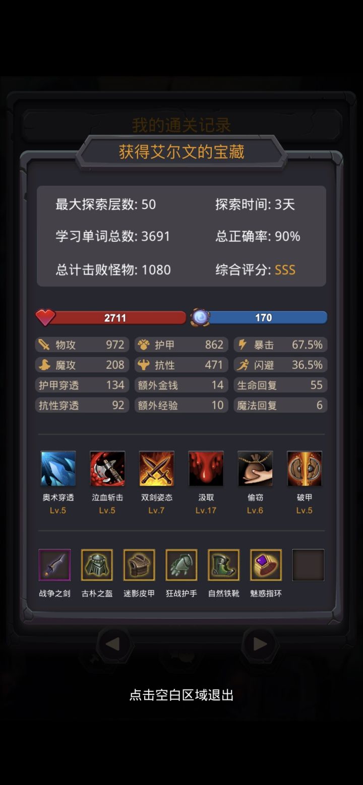 开始的前5层参考网友的攻略,靠着学习技能循环错最后一个单词的方法去累计review的单词量,大概总共用了2000个词去刷基础属性,后面打小怪基本就能一刀秒了。前期配个+金钱的武器,遇到NPC就买加属性的食物,升级+攻击和甲。技能里的汲取使劲升,其余的选抗性和甲,基本一路靠物攻打上去都毫无压力,可以认真记单词了