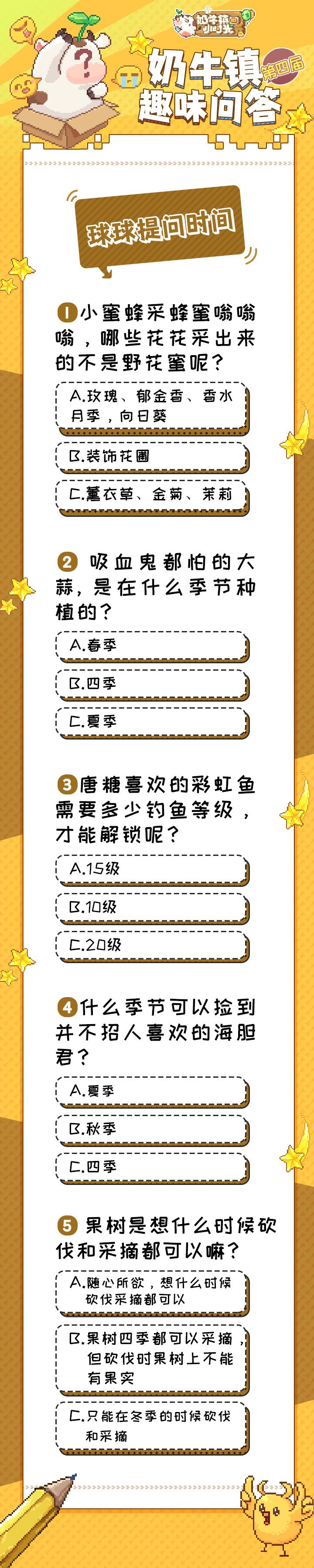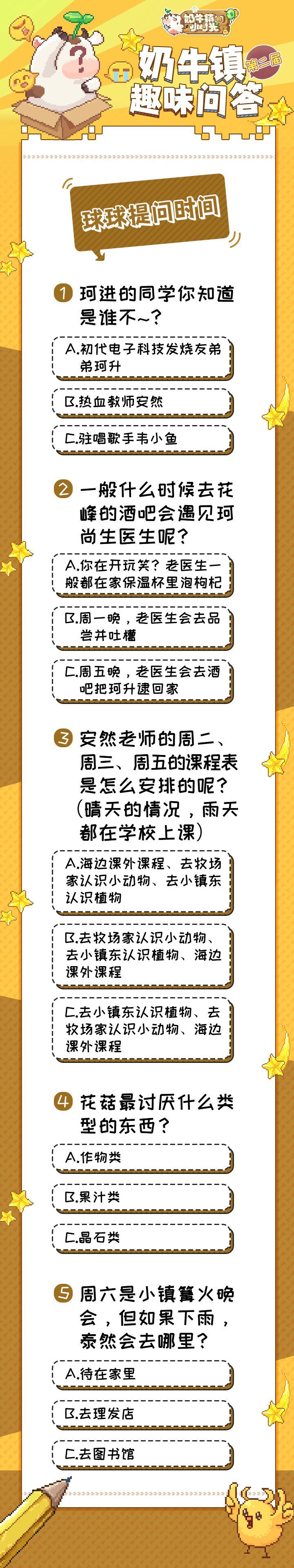 亲爱的奶牛镇的居民们,大家好呀~ 呜呼,万般闪耀的球球登场啦!小伙伴们没有看错,万众瞩目的第二届知识小竞赛终于来啦!新的小伙伴们入住奶牛镇也有一段时间了,想必对游戏的玩法和内容都了如指掌了,球球猜小伙伴们最了解的应该是NPC的吧~ 今天球球准备了一个趣味小问答,题目可能有点小难度,但对于机智的小伙伴们肯定so easy啦~ 小tips:可攻略居民在好感度达到3心后,点击奶牛镇社区界面下的约会选项,