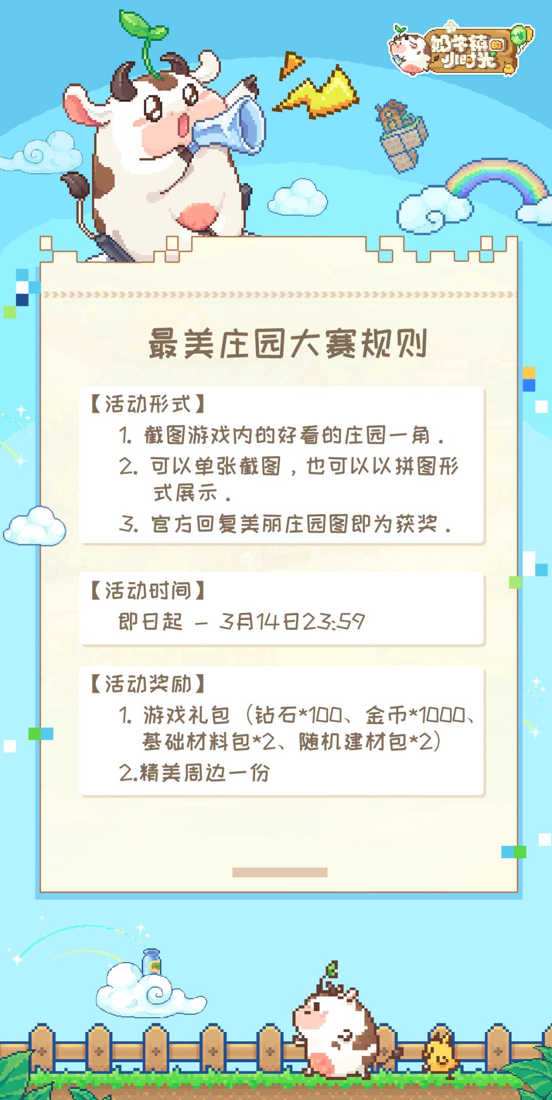 各位奶牛镇的居民小伙伴,大家好!我是最近在忙于处理奶牛镇各种事务的球球QAQ 奶牛镇也开放第二天啦,不知道各位小伙伴的奶牛镇新生活过得如何呢!有疑问、反馈或者建议,都非常欢迎小伙伴们移步我们的测试服论坛帖子或者进群找小鱼反馈(吐槽)~ 今天呢,球球身负重任,为了活跃奶牛镇的居民小伙伴们,球球举办了一个小活动~那就是晒出你的漂亮庄园!小小参与一下就有机会拿到奖励哦~!废话不多说,我们赶紧来看看活动规
