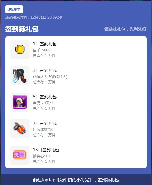 各位奶牛镇的居民小伙伴们在吗?乔乔带着福利来咯!开始整活! 活动时间: 2022年12月15日至12月31日,共持续半个月 活动规则: 在本页面点击【签到】即完成签到一次,活动期间内累计签到满15天,即可获得对应天数礼包。 活动入口: 进入奶牛镇的小时光论坛,顶部推荐位【签到福利】即可参与 参与方式: 1.通关活动入口进入活动页面 2.点击【立即签到】 3.满足累签天数,点击【领取】礼包 4.可在