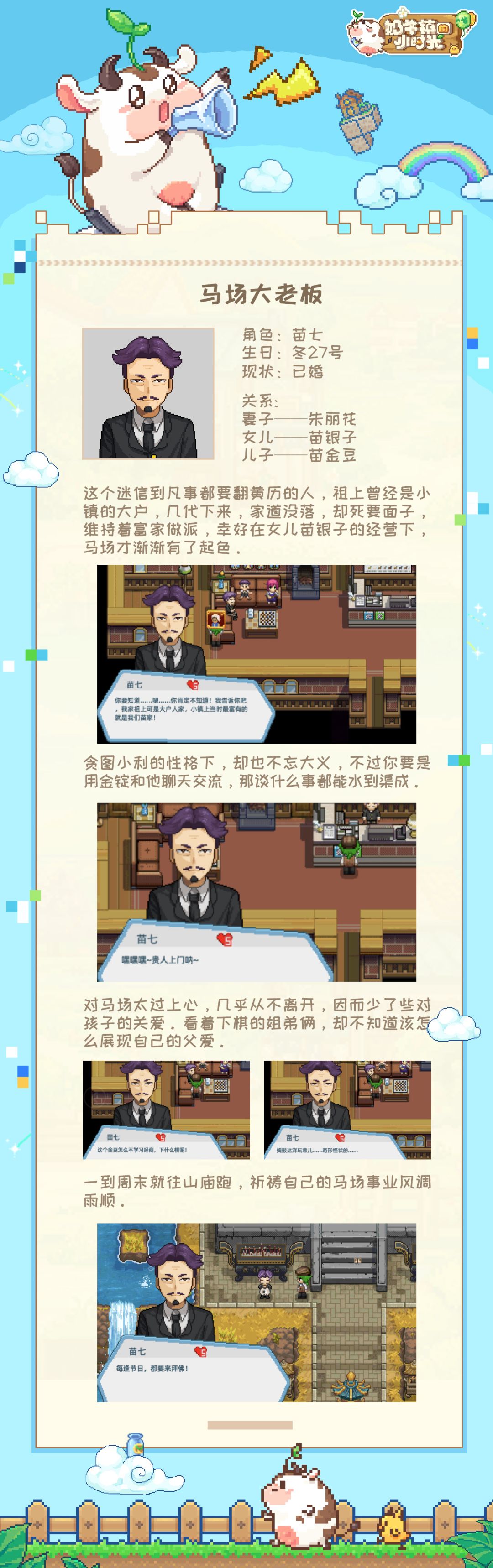 亲爱的奶牛镇居民们,大家好!一日不见如隔三秋,今天球球又准时带着NPC档案来啦~有没有很期待呢?(〃´-ω・) 这期要介绍的是镇北马场一家子哟!有金锭就万事好商量的苗七、经常外出找不到人的朱丽花、独自经营理发店的苗银子、未来的职业象棋选手苗金豆,他们又有着怎样不为人知的小故事呢?球球马上来为小伙伴们揭晓呀~ 另外另外,宠物猫猫、狗狗、小猪猪都是在马场商店购入的哟,店内出售的三种小马驹都是可以作为坐