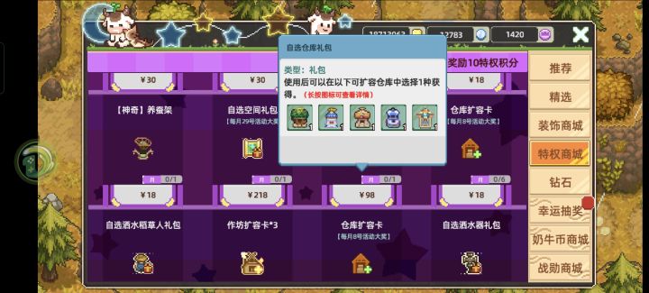 一、种植工具1.锄头(你得先挖个地吧)2.播种机(这是核心,必备)3.洒水器(也是核心,越多越好)4.水壶(升级到紫金就可,自动壶不是必备)二、相关Buff卡1.双倍积分卡(收获双倍分数)2.自动回收卡(收获同时自动回收植物)3.播种机超载卡(加速,加收割机收集范围,对萌新来说,没有那么多地需要这样快的车速去收菜,所以萌新的评价是:辣鸡🐔,不要买)4.祈雨卡×10(使用当天,立即